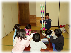 恒例「夜のミーティング」。 スキー器具の名称は指導を受ける時にけっこう大切なこと。 特に方向を表す「山側・谷川」、「トップ・テール」は感覚も合わせて理解しておきたい。